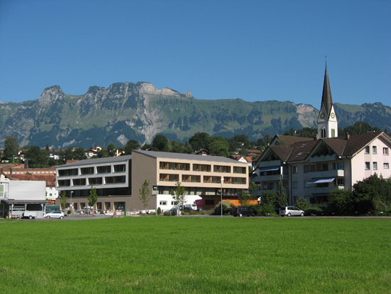 Das Sozialzentrum liegt im Dorfkern von Eschen, Liechtenstein, gleich neben der Kirche St. Martin |